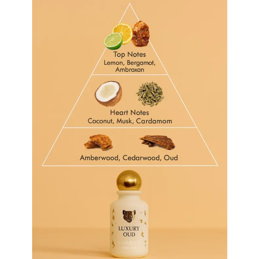 Indulge in the rich elegance of Luxury Oud Perfume by Surrati. This 100ml Eau De Parfum blends fresh lemon and bergamot with a warm heart of coconut, musk, and cardamom. Deep base notes of amberwood, cedarwood, and authentic Arabian oud create a powerful, long-lasting fragrance. Perfect for those who appreciate refined, sophisticated scents for any occasion.